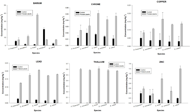 Figure 2 Comparison between the concentration of heavy metals (mg/kg) in the different species analyzed. The data indicate the concentration absorbed in contaminated species and controls. Data represents the average of three samples. There is a statistically significant interaction between control and contaminated species in the accumulation of Cr, Cu, Tl (p <0.01), Ba and Pb (p <0.05).
