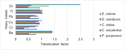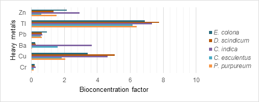 In the evaluation of the phytoremediation potential of the five selected species, Tl (P. purpureum, D. scindicum), Ba (D. scindicum, C. indica, E. colona) and Zn (E. colona, C. indica) hyperaccumulative plants were identified with the Tl (P. purpureum, D. scindicum), which have the capacity to transfer contaminants to the aerial part, however no hyperaccumulative plants with CBF were observed due to the higher concentration of metals in the substrate of the plants.