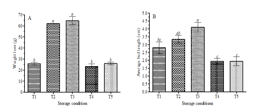 Figure 1 The effects of storage conditions on the weight loss (A) and the average bud length (B) of potato after ten weeks using Duncan’s multiple range test (P≤0.01). Different letters indicate significant difference between the values of pair of treatments. Vertical bars represent SEM. for three samples. T1; 4°C in the seed storage apparatus, T2; 25°C and T3: 30°C without rosemary leave and branches, T4; 25°C and T5; 30°C with rosemary leave and braches in the controlled incubator.