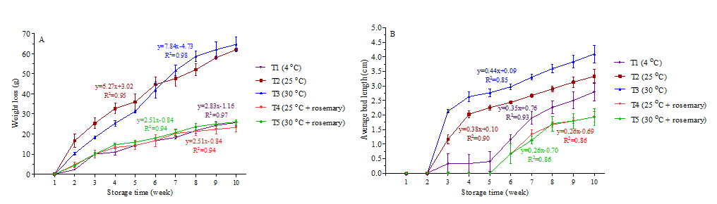 The slope of the weight loss at 25°C using rosemary showed 2.51 g decrease per storage time (one week) followed by 30°C with using rosemary, 4, 25 and 30°C without using rosemary leave and branches. The slope of the average bud length at 30°C using rosemary showed 0.26 cm increase per storage time (one week) followed by 25°C using rosemary, 4, 25 and 30°C without using rosemary leaves and branches (Figure 2). This might be due to the effect of storage conditions during the experimental period. As shown in Figure 2, after 10 weeks, the highest and lowest decrease in WL was observed at 25°C without using rosemary leaves and branches, and 25°C using rosemary leaves and branches, respectively. Interestingly, the amount of decrease in 25°C using rosemary leaves and branches condition was lower that of the normal storage condition (4°C) (Figure 2). In addition, application of rosemary leaves and branches at 25 and 30°C significantly decreased the ABL after 10 weeks of storage time (Figure 2).