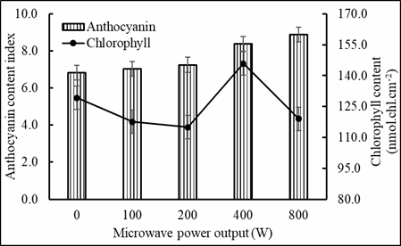 Chlorophyll content of dahlia plants applied with treatment 400 W was significantly (P<0.05) the highest (Figure 1). Treatments 100 W, 200 W and 800 W had low and similar effects on dahlia plant chlorophyll content. It is generally reported that when ambient temperature and light conditions are suitable for the synthesis of chlorophyll the lack of adequate nutrients typically N, sulphur (S), Fe, Mn and Cu can cause chlorosis and reduce photosynthesis and plant growth.12 Therefore, the variations in dahlia plant leaf tissue chlorophyll content will have differential impact on photosynthetic capacity and plant health status as reported by Ling et al.13 Although the individual nutrients were low in 400 W vermicast (Table 2) dahlia plants treated with the 400 W microwaved vermicast had the highest chlorophyll content as compared to the other treatments (Figure 1). This finding suggested that the nutrients in the 400 W treated vermicast were more balanced and more bioavailable for plant use as compared to the other treatments. Furthermore, an increase in microwave irradiation power output level from 100 W to 800 W consistently increased anthocyanin content of the dahlia plants i.e. 0 W<100 W<200 W<400 W<800 W (Figure 1). Again, the 400 W treatment recorded the highest anthocyanin content of the plant tissues, which was not significantly (P>0.05) different from the 800 W treatment. According to Oberbauen and Starr (2002), anthocyanin accumulation increases leaf tissue flavonoid concentration and enhances photosynthesis, which can be beneficial to dahlia plants treated with the 400 W microwaved vermicast.