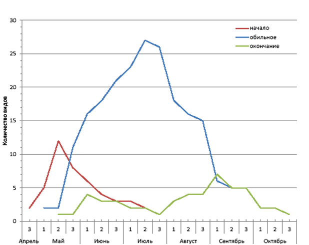 To evaluate quality of bee pasturages and estimation of their use duration during a season it was made up a flowering diagram, essence of which is in distribution of a total number of honey plants flowering on different stages for the whole honey flow season by ten-day intervals. Duration of flowering, times of start and end of honey plant flowering significantly vary (Figure 2).