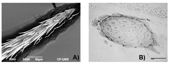 Figure 1 External structure of glochids (A); cross section of the glochid (B), at SEM.9