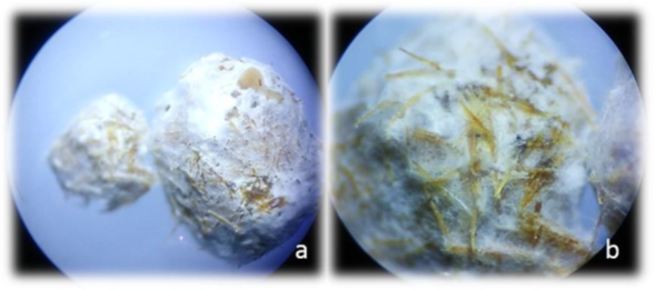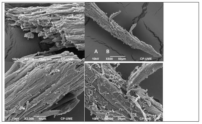 Based on these successful results, the same researchers evaluated the glochid residue as a improver component of oat straw, in a 40% proportion, for the commercial production of Pleurotus spp. carpophores through the parameters of productivity, earliness and economic indicators. The straw-residue mixture significantly decreased the number of days required for colonization with respect to the control, with yield percentages of 38.3±10.9, biological efficiencies of 132.3±37.5% and production rates of 3±0.9%. The evidence was conclusive: agricultural waste in the ratio 40:60 (v/v) can be used as a substrate improver component to produce Pleurotus spp. The estimated economic benefits are summarized in savings in production costs and higher net profit with respect to traditional substrates to produce both mycelium and carpophores, in addition to the ecological benefits that its use could imply.17 In addition, stereoscopic observations showed that the hyphae break the crystalline structure of the glochids, which facilitates the manipulation of the residue (Figure 3).