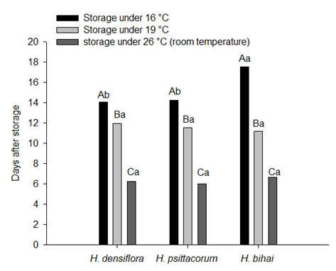 Figure 3 Days of storage of flower stems of Heliconiadensiflora, H. psittacorumvar. Golden Torch, and H. bihai (Maluca) stored at temperatures of 16 and 19 °C in a cold chamber and 26 °C in an ambient condition. Uppercase letters compare the species evaluated and lowercase letters the storage temperatures by the Scott Knott test at 5% probability. Tangará da Serra - Brazil, 2017.