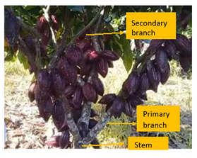 The reproductive structure of the cacao tree is basically made up of the stem, primary branches and secondary branches. Floral cushions, flowers and fruits are formed in these organs (Figure 1).