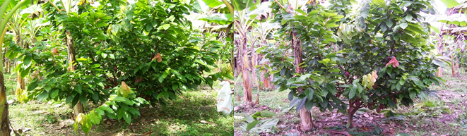 Figure 4 shows the general appearance of a cloned cacao crop subject to appropriate maintenance pruning. And Figure 5 shows in detail what is known as "hard pruning" consisting of the elimination of a large part of the leaf area of the trees and of already formed branches, severely affecting their productive potential.