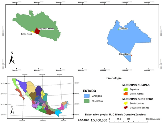 Figure 1 State of Guerrero and Chiapas, Mexico, where nanche fruits (Byrsonima crassifolia, L.) were sampled.