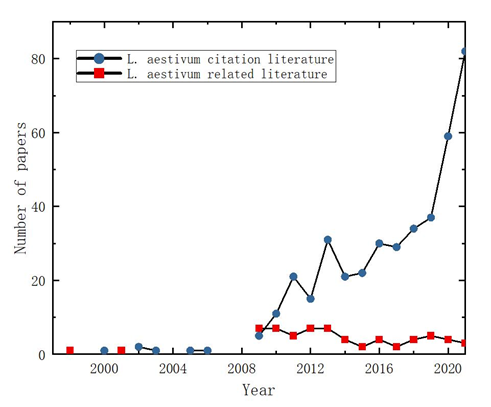 The annual number of international publications on L. aestivum-related studies obtained from WOS and CNKI is shown in Figure 1. The number of international publications on L. aestivum showed a flat trend. In contrast, the number of citations in the literature related to L. aestivum showed an increasing trend, and the number of publications in Chinese was much lower than that in English.