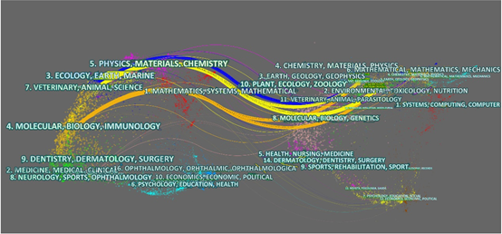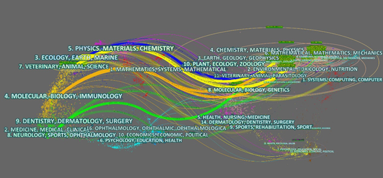 The double graph superposition knowledge map of journals with Cite Space software can show the distribution of literature and citation trajectory of each discipline, which can further study the pulse of knowledge development among journals and reveal the law of knowledge dissemination.30 Figures 2&3 show the biplot overlay mapping of journals in L. aestivum research fields and related fields, with the cited literature (i.e., L. aestivum-related literature) on the left side representing the applied research field of the discipline and the cited literature on the right side describing the primary research field of the domain. The length of the horizontal axis of the oval in the figure is proportional to the number of authors, and the size of the vertical axis is proportional to the number of papers published in the corresponding journals; the lines in the figure represent the connection between the cited literature and the cited journals in a particular field, and their thickness and density indicate the frequency and intensity of knowledge flow between journals;31 Comparing Figure 2 with Figure 3,that most of the cited literature related to L. aestivum is in the same field as the original literature, and is more widely studied in botany, environmental science, and biology proved that. This shows that most of the cited literature on L. aestivum is in the same field as the original literature and is more extensive in botany, environmental science, and biology. In summary, the research in this field crosses and integrates multiple disciplines such as geology, ecology, biology, botany, zoology, veterinary medicine, molecular science, and immunology. And with botany, environmental science, and ecology as the basic disciplines to expand to a broader range of disciplines, it has more significant potential development.