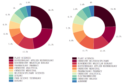 From the analysis of published papers involving disciplines (Figure 4), it can be seen that the literature related to L. aestivum is mainly concentrated in botany, biotechnology, biochemistry, followed by pharmacology, chemical analysis, etc.; the literature cited by L. aestivum is primarily focused in botany, multidisciplinary chemistry, biochemistry, followed by biotechnology applications, microbiology, medicinal chemistry, etc. This analysis indicates that this field has become a common research topic in botany, biology, chemistry, and other disciplines.