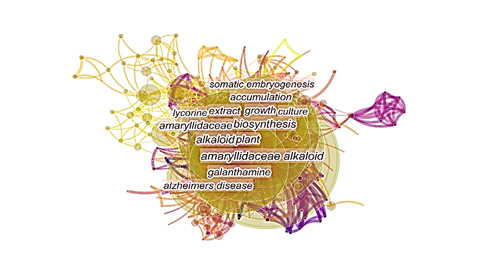 In the keyword co-occurrence data of L. aestivum-related literature, "L. aestivum" was the largest node in the network with 32 occurrences, followed by "Lycoris Herb. "Biosynthesis" occurred more than ten times. In the keyword co-occurrence data of L. aestivum citation literature, i.e., the keyword co-occurrence data of the disciplinary frontier area, "galanthamine alkaloids" accounted for the largest number of nodes, with 59 occurrences. This was followed by "plant," "biosynthesis," "growth," "alkaloids" and "Galanthamine," all appearing more than 40 times. Other representative keywords include "Alzheimer's disease," "culture," and "Lycoris plant." From Figure 7, we can see that the keywords mainly focus on three aspects: Lycoris plant, alkaloid synthesis, and plant culture.Combined with the keyword analysis, it can be seen that the Lycoris plant is the primary source of alkaloids such as Lycoris alkaloids and galanthamine.Plant culture and the improvement of biosynthesis technology arethe research hotspots in this field. Researchers have also carried out a series of investigations on the growth and reproduction breeding of L. aestivumin to hope that the improvement of external conditions of plants will increase the alkaloid production of L. aestivum through the advancement of external conditions.33-36