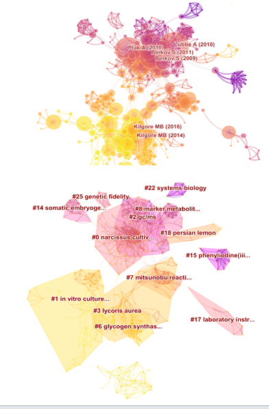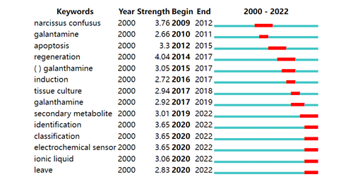 As shown in Figure 9, the top 5 clusters of network mapping are #0, #1, #2, #3, and #6, respectively. Cluster #0 consists of 73 members and focuses on stem segment culture and galanthamine production; the high citations literature was led by Georgiev in this cluster, and the team successfully cultivated stem segments of L. aestivum in an advanced modified columnar glass bioreactor by tissue, expecting to provide new access to Lycoris alkaloids using stem tip culture.83,84 The #2 cluster consists of 48 members and focuses on the production of Lycoris alkaloids and the evaluation of cholinesterase activity. The most cited article in the cluster is from the team of Parolo that concentrate on describing the habitat requirements, reproduction, and population biology of the species by discussing the taxonomy, status, morphology, distribution, ecology, and population biology of L. aestivum, and summarize the progress of L. aestivum research.85 The #3 cluster consists of 45 members and focuses on the Lycoris area. These more cited articles were from Li86 in this cluster. The team conducted treatment experiments on Lycoris longituba using MeJA to analyze the galanthamine content in plants under different treatment days and to studythe MeJA-mediated mechanism of galanthamine synthesis in Lycoris longitubain Lycoris. Cluster #6 consists of 22 members and focuses on stem tip culture and galanthamine production; Kohelová's team found out that derivatives of β-Crinane of Lycoris, which was cited are highly, and studied the inhibiting potential to acetylcholinesterase and butyrylcholinesterase to evaluate inhibition capacity of the active derivativeson glycogen synthase 3p ( GSK-3β), which will offer the new drug for the treatment of Alzheimer's disease.87