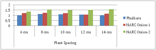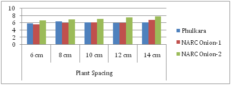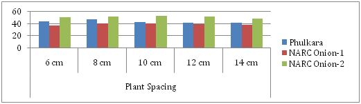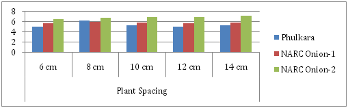 Both onion strains (NARC Onion-1 & NARC Onion-2) produced as number of leaves as that of Phulkara used as check. Also increase or decrease in plant spacing compared to control (10cm) had not affected significantly number of leaves per plant (Figure 2). Our results are opposite to Dharmendra et al.,2 Khan et al.,3 Dawar et al.6 which showed that wider spacing produced maximum number of green leaves compared to closer spacing.