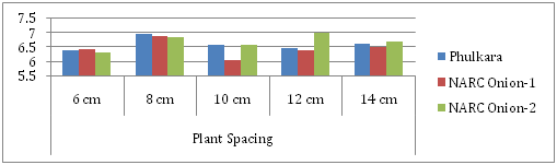 A significant difference for maturity days was observed among two onion strains and control (Phulkara). Onion strain NARC-2 proved early maturing compared to other two entries. Beside this, with the decrease in plant population, a significant delay in maturity was observed (Figure 5). Early maturity was recorded at plant spacing of 8cm. Rumpel et al.5 also reported, that plant density hastened the maturity of onion to some extent.