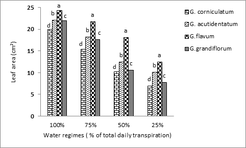 Analysis of variance indicated significant differences among species and among water regimes and their interactions (Table 1). Linear regression indicated a significant negative association between leaf area and water regimes (Table 2). Leaf area decreased linearly in all species with increasing drought with a sharp drop at the water regime of 25% of the total evapotranspiration. G. flavum achieved the highest leaf area at all water regimes followed by G. acutidentatum, G. grandiflorum and G. corniculatum. G. flavum acheived an average leaf area of 24.3 cm2, while G. acutidentatum achieved leaf area of 22.2 cm2 at 100% ET. G. grandiflorum was ranked third with an average leaf area of 22.0 cm2 while G. corniculatum had the lowest leaf area of 19.9 cm2 with control treatment (Figure 2). Leaf area decreased from 23 to 21.8, 18.1 and 12.5 cm2 in G. flavum; from 22.2 to 18.2, 12.5, and 10.2 cm2 in G. acutidentatum, from 22.0 to17.7, 10.6, and 7.8 cm2 in G. grandiflorum, and from 19.9 to 15.4, 10.3, and 7.0 cm2 in G. corniculatum with increased drought from the control to 75, 50 and 25% ET, respectively (Figure 2). It is logic that the leaf area followed the trend of leaf color since healthy leaves should have a greater leaf area. Although there was considerable decrease in overall leaf area in G. flavum, it appeared to be the most drought tolerant species. Water stress is one of the most common environmental factors affecting plant growth and productivity. Reduced water availability induces numerous physiological and biochemical changes in all plant organs.