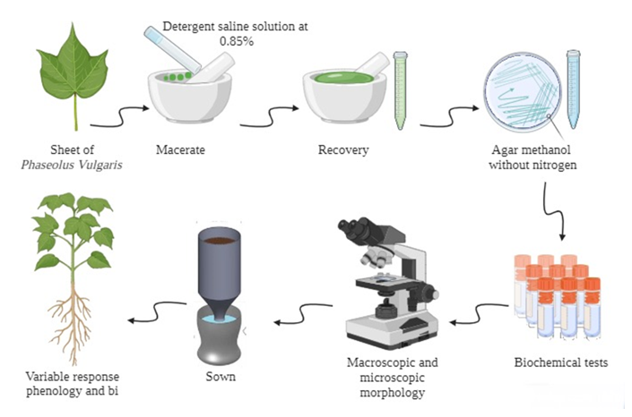 Figure 1 Isolation and inoculation of Methylobacterium symbioticum in Phaseolus vulgaris plus NH4NO3 at 50% The diagram of the materials and methods was generated by this laboratory, or Environmental Microbiology Laboratory-UMSNH.