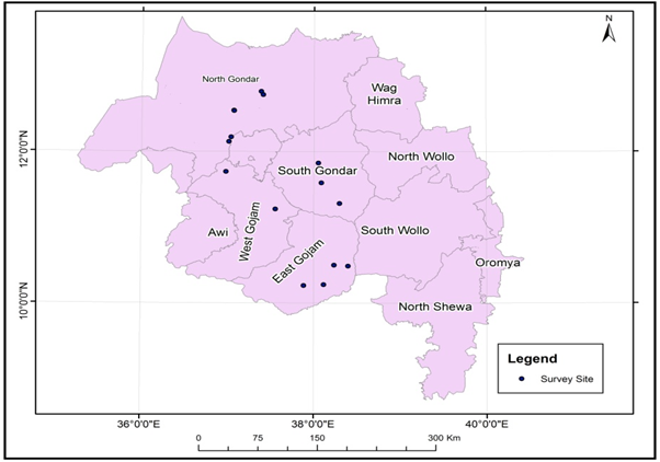 The study was conducted in four Zonal Administration namely East Gojam, West Gojam, North Gondar and South Gondar in12 Woredas (Districts) of Northwest Amhara Regional State, Ethiopia. The selections of a study area were based on annual report of Bureau of Agriculture (BoA), Zonal and woreda offices of Agriculture (WoA) on their potential of tef producting.