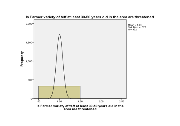 As the graphic presentation of identified threatened farmers’ varieties of tef revealed that, the lowest and the highest frequency was 1 to 155 respectively. From 332 respondent’s frequencies of 41 to 155 were eight varieties of tef are more expose to erosion.