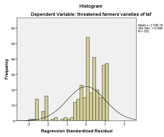 Decriptive statistical analysis of threatened farmers’ variety of tef at least 30-50 years old in the area shows that, they are slightly skewned to the left. As the result revealed in (Table 3), mean is less than median (mean=30.31 and median= 34.00) and the extent of score distribution in histogram graph is tell us slightly deviates from perfect symmetry.