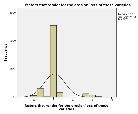 Decriptive statistical analysis of factors render for the erosion of land race tef variety shows that, they are almost skewned to the right. As the result revealed in (Table 3), mean is grater than median (mean=3.17, median=3 and mode=3) and the extent of score distribution in histogram graph is tell us slightly deviates from perfect symmetry.