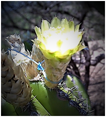 Our own data indicate that the probability that the developing areole will become a bud is 28% and from bud to flower is only 0.54%. Flowers that develop at the tip of the branch are infundibuliform, 3 cm long, including the ovary (Figure 2). The inner perianth segments are yellow and acuminate. The pericarpal and the tube have big, yellow-bright- paper-like (Figure 3), translucent, pungent, acuminate scales; armpits lack wool; stamens are yellow; the stigma has 8 to 10 lobes. There is a 15% probability that the flower will produce fruits.