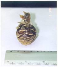 Jiotilla looks like a small (3 to 5 cm diameter, 20-25 g) red-purple pineapple, with yellow, paper-like (Figure 4), scales and spines at the base. The pulp is purple and edible with a sweet and sour flavor that sometimes has an aftertaste like a tomato. Jiotilla seeds (15 mm long) are black with a wide basal hilum and a rough seed coat.