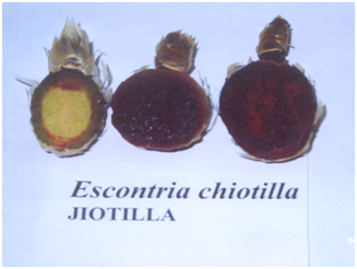 One of the most important features of jiotilla fruit are the deep red (purple) pigments. Dominant pigments are betaxantines (yellow pigments), although the most visible color in the fruit is red purple, suggesting that hypothetically betanine is the predominant one Figure 5.