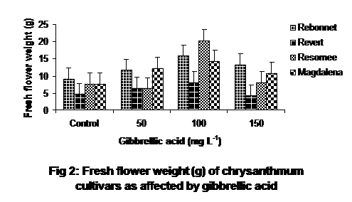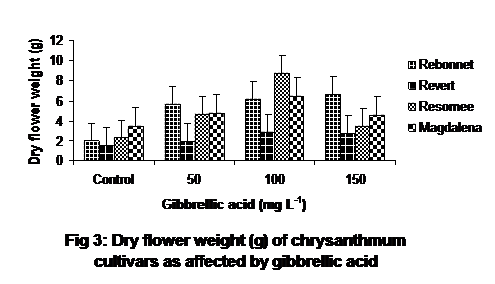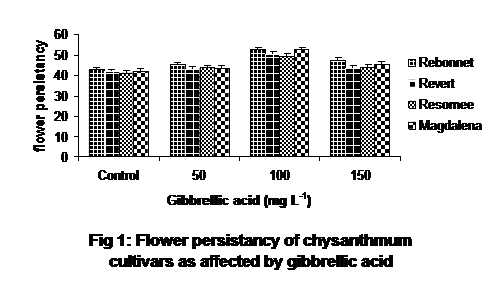 Table 2 Flower persistency, fresh flower weight (g), dry flower weight (g) of chrysanthemum cultivars as affected by gibbrellic acid (GA3)