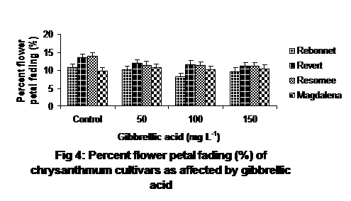 Table 3 Post harvest flower life, Percent flower petal fading (%) of chrysanthemum cultivars as affected by gibbrellic acid (GA3)