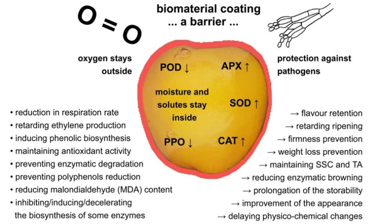 The success of the edible coatings/films derived from the biomaterials is mainly depended on the barrier ability, adhesion potential, thickness, uniformity, plasticity, flexibility, waxiness and sensory quality.9,14 The mode of action behind the success of biomaterials is material dependent. The main ones are the ability to reduce respiration rate, retarding ethylene production, oxidation-reduction, preventing enzymatic degradation, preventing polyphenols reduction and maintaining antioxidant activity. This includes inducing phenolic biosynthesis, reducing malondialdehyde (MDA) content and inhibiting/inducing/decelerating the biosynthesis of some enzymes, i.e., peroxidase (POD ¯), polyphenol oxidase (PPO ¯), ascorbate peroxidase (APX ), catalase (CAT ) and superoxide dismutase (SOD ).9,15,16 Besides to the biodegradability and safety, the main advantages/outcomes of the biomaterials in postharvest practices are retarding ripening, prolongation of the storability, pathogen inhibition ability, improvement of the appearance, delaying Physico-chemical changes, improving firmness, flavour retention, maintaining soluble solids and titratable acidity and reducing enzymatic browning3,9 (Figure 1).