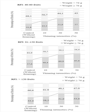 Figure 1 Percentage of mangosteen fruits G. mangostana by weight category (g), corresponding to three initial fruiting ranges (RFI) and thinning intensity (%) treatments.