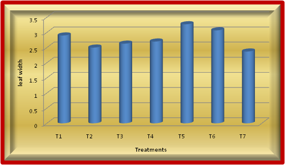 In this study, significant to highly significant influence on leaf width was showed by the organic manures. Among the different treatments, the treatment T5 (Vermicompost@2.5tha-1+Humic Acid@0.3%) registered higher leaf length (3.27cm respectively). It was followed by the treatment T6 (Vermicompost@2.5tha-1+ Panchagavya@3%) which showed 3.07cm. Meanwhile, the least leaf width 2.47 cm were registered by the treatment T7 (control).