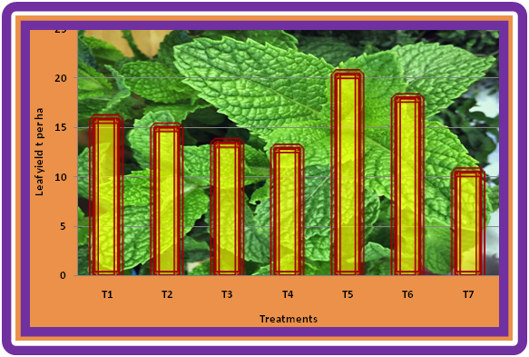 The higher leaf yield 80.93 g plant-1 were recorded by the treatment T5 (Vermicompost @2.5tha-1+Humic Acid @0.3%). This was followed by the treatment T6 (Vermicompost @2.5 tha-1 Panchagavya@3%) with the leaf yield values of 71.40 g plant-1. However, the lowest leaf yield was observed by the treatment T7 (control). Among the different treatment, the highest estimated leaf yield were registered by the treatment of T5 (Vermicompost@2.5tha-1+Humic Acid@0.3%) estimated leaf yield of 20.23 tha-1. It was followed by the treatment T6 (Vermicompost@2.5tha-1+Panchagavya@3%). The lowest estimated leaf yield was recorded by the treatment T7 (control) with the values of 10.04 tha-1s (Figure 1) (Figure 2).