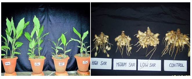 A pot experiment were carried out by growing mango ginger in naturally collected sodic soils from different places at Banthara village near Lucknow-Kanpur High way, Lucknow, U.P., India, having different levels of ESP i.e., control (4.37ESP), low (15.7ESP), medium (35.6ESP) and high (54.5ESP) with four replicates in complete randomized design (CRD). ESP is a standard diagnostic parameter for the sodicity hazard of a soil. {\displaystyle {\text{SAR}}={\frac {Na^{+}}{\sqrt {{\tfrac {1}{2}}({Ca^{2+}+Mg^{2+}})}}}}The study was conducted in earthen pots to know the tolerance limit of plant at different ESP levels at which plant can easily grow and reproduce. The soil were collected up to 15 cm depth (surface soils) only and kept it for drying. After drying the soils were thoroughly crushed and properly mixed. The soils were analyzed after processing and chemical properties of soil were indicated in the Table 1. The earthen clay pots were lined on their inner side alkathene sheets to check the leaching and contamination from the clay of the pots of 15kg soils were filled in each pot, 5 rhizome of mango ginger were transplanted in may and thinning as done after germination of plantlets to allow 4 plants to grow in each pot. A basal dose nutrients of 200mgNkg-1 soil as Ca(NO3)2 and 100mgPkg-1 soils as KH2PO4 and 100mgkg-1 soil as MgSO4 were applied to all plant in two split doses during crop growth.
