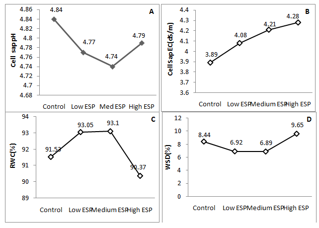 Figure 2 Effect of soil sodicity on the cell sap pH, EC, water relation, water potential (Ψ: showed negative values) of mango ginger (Curcuma amada).