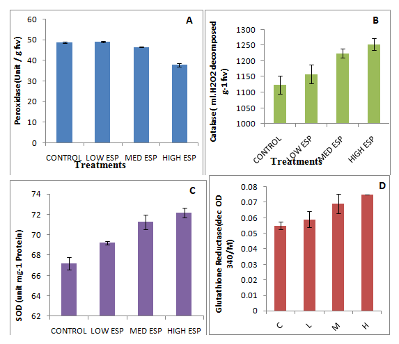 Figure 3 Effect of sodicity on anti-oxidatives enzymes (A; peroxidase, B; catalase, C;superoxide dismutase, D; glutathione reductase) of Curcuma amada.