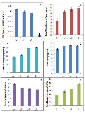 H2O2 content was estimated in supernatant prepared by freshly chopped leaf in 100% chilled acetone and centrifuged at 10,000g for 5min (Brennan and Frenkel).28 The colour intensity was read at 415nm. The results have been expressed as μmol H2O2g-1 fresh weight. Total Phenol content was determined calorimetrically with Folin Ciolcalteu (FC) reagent in the leaf extract which was shaken thoroughly and made up to 10mL using distilled water and 1.5mL of 20% sodium carbonate.29 The absorbance of resulting solution was measured at 765nm in UV-spectrophotometer. Prolien content was estimated by the method of Bates et al.30 Freshly chopped leaves were ground in sulphosalicylic acid and filter with Whatman No.1, a suitable aliquot was taken with ninhydrin reagent and glacial acetic acid and boiled for 1h. The colour was extracted in toluene and read at 520nm.