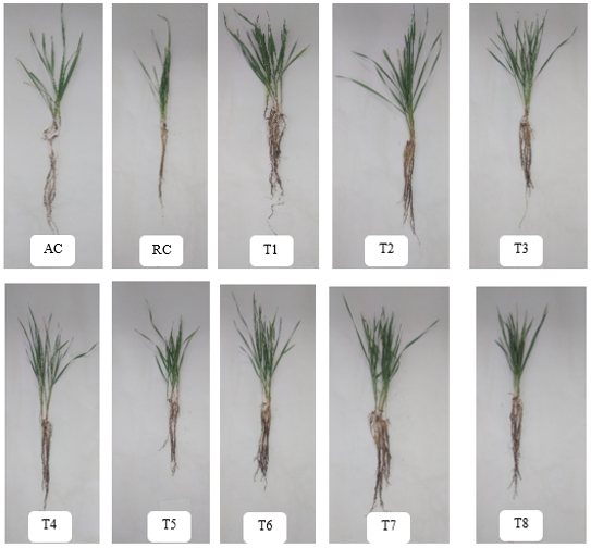 T. aestivum had a positive response to X. autotrophicus and B. thuringiensis enhanced by ECNPCs (T1-T8) on seedling stage of growth are visually evident (Figure 2). A largest stem diameter is observed in T. aestivum with X. autotrophicus and/or B. thuringiensis plus ECNPCs this fact suggests that X. autotrophicus and B. thuringiensis they convert compounds of the photosynthesis metabolism into phytohormons such as auxin to induce an accelerated formation of dense roots in this way the root system enhancing the exploration capacity increased the exploration capacity of the soil improved by CECNPs for the optimization of 50% of NH4NO3 in comparison to T. aestivum without any EPGPB, fed with 100% of NH4NO3regard as a relative control showing that normally T.aestivum not inoculated with EPGPB was unable to effectively absorb of NH4NO3 for better growth causing soil lost fertility and environmental pollution.9,13,17