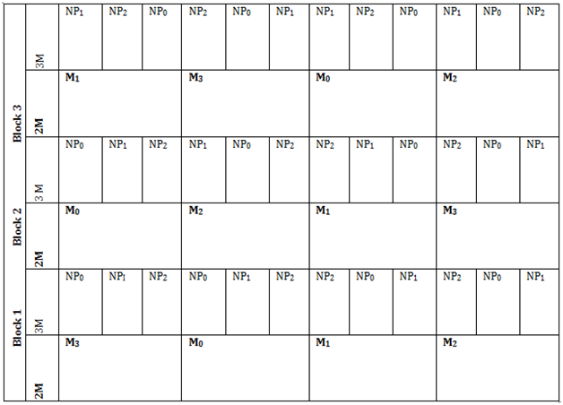 The experimental design was a split plot factorial arrangement of treatments embedded in a randomized complete block design (RCBD) with three replications. The factors studied included: (1) organic fertilizer in the form of cattle manure at the rates of 0 (M0), 2.5 (M1), 5 (M2) and 7.5 (M3)tha-1, as the main plots and (2) inorganic fertilizer in the form of DAP (at planting) and CAN (as a top dress) at the rates of 0 (NP0), 50 (NP1) and 100 (NP2) kgN/ P2O5 ha-1) as the sub plot (Figure 1). DAP and CAN are common inorganic fertilizers used during planting and top dressing, respectively. Nitrogen was applied in two equal splits as calcium ammonium nitrate (CAN, 26% N) while phosphorus was applied as diamonium phosphate (DAP, 46% P2O5). Phosphorus was applied at planting, by placing the fertilizer in the planting holes and thoroughly mixing with top soil. Similarly, manure was applied at planting in the planting holes. Manure tested had nutrient content of 17.3gkg-1N, 52mgkg-1P, 0.21mgkg-1K and a pH of 5.2. The first application of CAN was done four weeks after planting, and a second one, three weeks later.