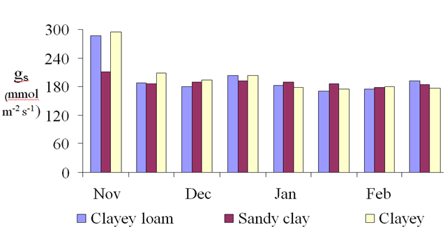 Figure 2 Stomatal conductance (gs) in grapevine with drip irrigation in three soil texture of an Ultic Palexeralfs during the growing season.