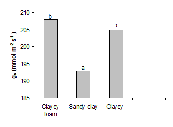 Regarding soil texture, the lower gs was found in sandy clay (193 mmol m-2 s-1 ) that indicate a mild water stress in comparison with clayey loam (208 mmol m-2 s-1) and clayey soil (205 mmol m-2 s-1) (Figure 3), probably because the applied water volume was lower (1987 m3 ha-1) that the vine water requirements . Besides, the sandy soils have lower water-holding capacity that decreased the leaf gas exchange.13