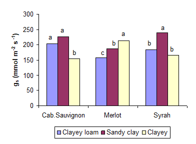 Figure 4 Stomatal conductance (gs) in grapevine ‘Cabernet-Sauvignon’, ‘Merlot’ y ‘Syrah’ with drip irrigation in three soil texture of an Ultic Palexeralfs. Differents letters on each column indicate significant differences at p ≤0.05) according Duncan’s test.