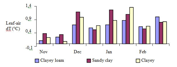 Regarding leaf-air dT (ºC), the vines showed positive values in December and January about 1,4º C in the sandy clay (Figure 5) indicating temporary and mild water stress due to lower water-holding capacity of the soil.13