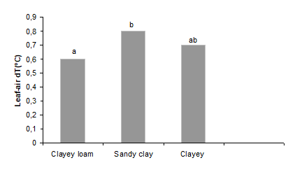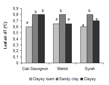 The effect of soil texture was significative (p≤0,05) on the leaf-air dT (Figure 6) with positive values in sandy clay (0,8 °C) that indicating mild water stress in comparison with vines planted in clayey loam and clayey soil. This is in accordance with the results of gs ,due to lower water availability of sandy clay (7,0%) as compared with clayey loam (8,4%) and clayey soil (11,25%). According to Ubalde et al.20 the soil properties related to soil moisture regime have a direct influence on vineyard management and grape quality.