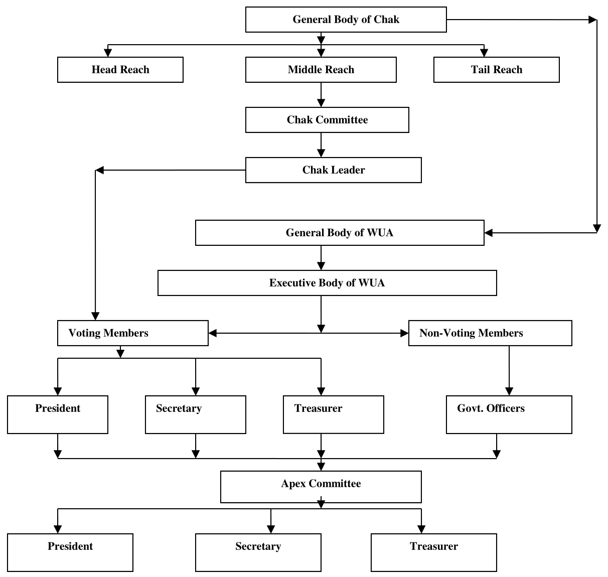 The main responsibilities of WUAs (or Pani Panchayat in Odia) include the collection of water rates, distribution of canal water among beneficiaries, operation and maintenance of canals at lower levels like minor, sub-minor, and distributary level. Generally, WUAs are created on a three-tier system with two informal associations and one formal association on hydraulic boundaries ranging from 300ha to 600ha of commanded area. At the lowest level, a chak committee is formed at the head, middle and tail reach of the ayacut of an outlet. A representative, called the chak leader of each of these levels is an executive member of the WUAs. The president, vice-president, secretary, and treasurer of WUAs are elected from the executive body of the concerned WUAs. All water users are members of the general body of the WUAs. At the project level, a federation of all WUAs is established. This body is called the Apex Committee and has a formal but non-binding advisory role in mail system operation and maintenance. The executive members of the Apex Committee are elected from the presidents of all WUAs within the command are jurisdiction of the irrigation project. The Organizational structure of WUAs can be observed from figure 2.
