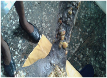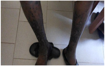 Mr. K. O a 39year old man was referred to our Pain and Palliative Medicine Department from a Secondary level of care for pain management. He presented at our usual Tuesday HIV/AIDS clinic on account of hyper-pigmented, papular nodular lesions on the right lower Limb with some disability. There was also evidence of bone and surrounding neurovascular tissues involvement. He was diagnosed to be sero-positive about four years ago and on Highly Active Anti-Retroviral Therapy (HAART) with an initial CD4 count of 275cells/ul. His CD4 count had nose-dived at the time of referral to 84cells/ul, was seriously in pain, suffering of numerous psychosocial issues, socio-emotionally depressed especially about the body image disfigured leg lesions. Fear of the unknown, Shy, introverted, withdrawn and had self-guilt about his medical status and late presentation. The spouse and the two children were sero-negative and very supportive. His clinical condition appeared to be further deteriorating as the CD4 count level was not improving and an impression of an immunological failure was being considered. The care plans included switching his current HAART from the lamivudine, tenofovir and efaverenz. In line with palliative care philosophy, there was need for a family meeting to towards patient and family social, emotional and spiritual care support. There was also an urgent need to co-manage the patient with a dermatologist in view of the skin lesions and diagnosis of Kaposi’s sarcoma (KS).