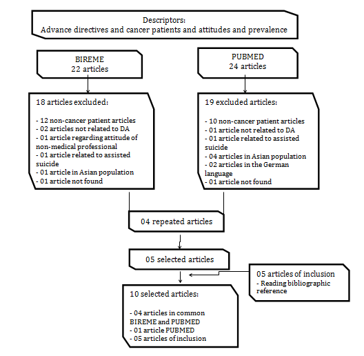 After reading the title and abstract of 46 articles, 34 articles were excluded from the data source LILACS/ BIREME and 19 PUBMED articles. Subjects whose sample was not cancer patients, who did not address AD in oncology patients or whose attitudes assessment referred to non-medical professionals and those in Asian populations were excluded. 04 articles were selected in the sources of BIREME / LILACS and 05 articles in PUBMED; 04 articles were repeated in the two different sources. The study included five articles, randomly found in literature reference readings that meet the inclusion criteria. At the end, a total of 10 articles were selected for analysis considering the specific information of each article (Figure 1). The quantitative data on the prevalence of AD in cancer patients before and after the diagnosis of cancer, patient’s attitudes regarding the diagnosis of cancer in relation to AD and end-of-life care and the attitudes of medical oncologists to define end-of-life care and discuss AD with their patients were analyzed for the description in this study.