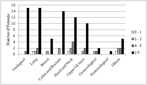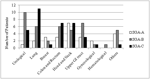 Tumor sites presenting poor nutritional status according to the PG-SGA were lung and colorectal, 57.9% and 43.7% were SGA-C, respectively. Regarding numerical score, genitourinary (93.8%) and colorectal (87.5%) had higher frequency score≥9 (Figure 1 and 2).