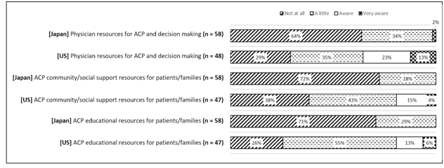 In conclusion, findings revealed that although physicians from both medical centers recognized the importance of ACP, they appeared to not engage in its practice themselves, as evident by how most Japanese physicians (91%) and more than half of US physicians (53%) did not have an AD on file. Findings also indicated that in both medical centers, most physicians were not aware of community, social support, and educational resources for patients and their families on ACP, as well as the resources available for ACP and decision making for them. Overall, the physicians appeared to believe that additional training on ACP would at least be a little helpful or greater benefit. In considering Medicare’s reimbursement changes for ACP, additional training might be particularly helpful for USA based physicians. Hence further study is recommended to gauge the efficacy of trainings, as measured by physicians’ self-reported confidence, knowledge, and practices regarding ACP.